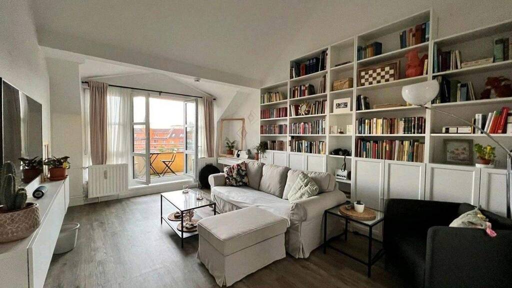 Das Wohnzimmer mit Balkon hat eine Dachschräge und eine bis zu 4m hohe Decke. Zur Verfügung stehen ein Samsung Frame Fernseher.