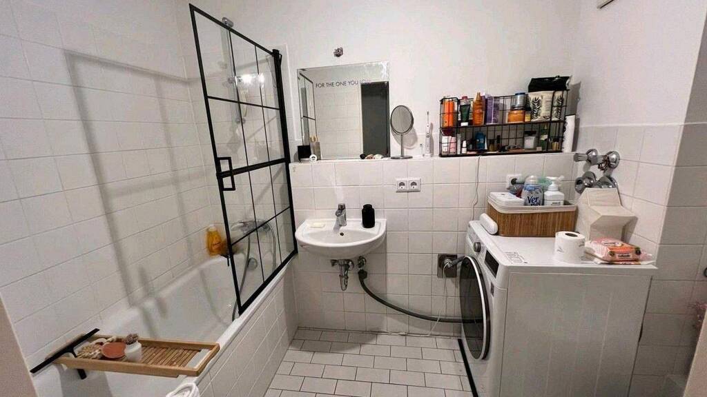 Das Bad verfügt über eine Badewanne und eine 9 kg Waschmaschine.