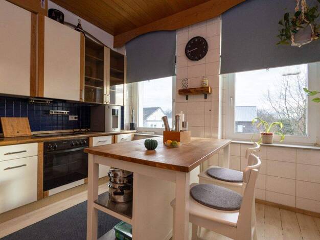 Erdgeschoss: Eingangsbereich, große Küche, Wohn-Esszimmer, Gäste-WC, Wasch- und Heizungsraum Treppe nach oben Dachgeschoss: kleines Zimmer, Badezimmer mit Dusche, Badewanne, Kinderzimmer, Schlafzimme...