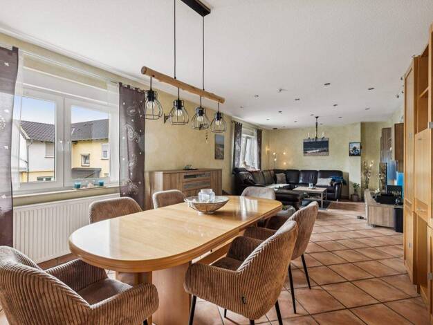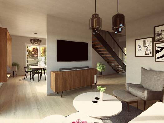 Im Erdgeschoss dieses Einfamilienhauses empfängt Sie ein großzügiges und offenes Wohnzimmer, das nahtlos ins Esszimmer und anschließend in die Küche übergeht. Diese lichtdurchflutete Raumgestaltung s...