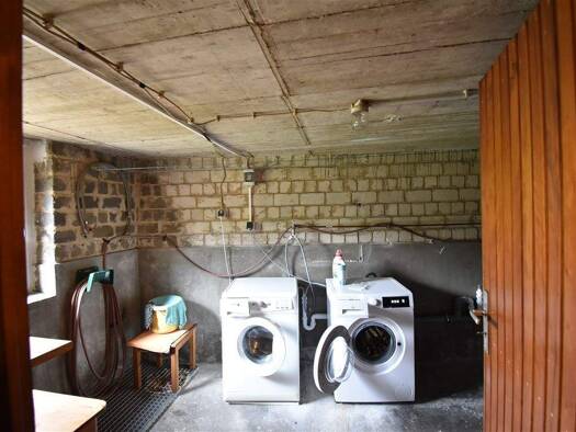 Einseitig angebautes Zweifamilienhaus mit zwei Etagen und Keller, mit einer Wohnfläche von 50/54 m², Baujahr 1927 - Aufteilung der Räume: Keller: Flur, 5 Kellerräume; Erdgeschoss: Flur, Abstellraum, ...