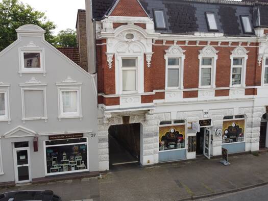 Dieses Gebäudeensemble umfasst ein Wohn- und Geschäftshaus mit zwei Wohneinheiten, einer Gewerbeeinheit, Balkonen und einem Kellergeschoss. Es ist zweigeschossig mit einem ausgebauten Dachgeschoss un...