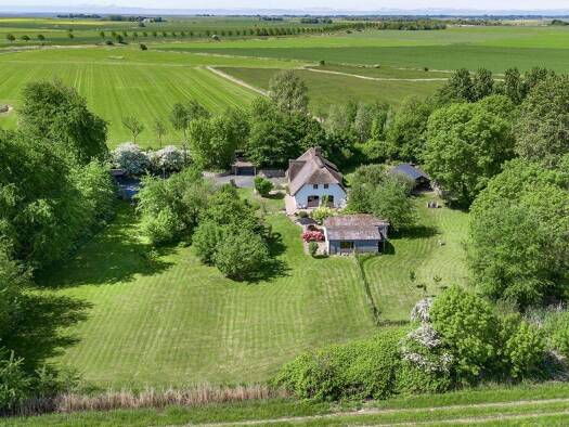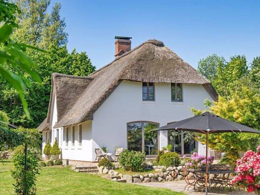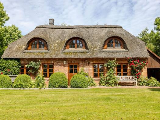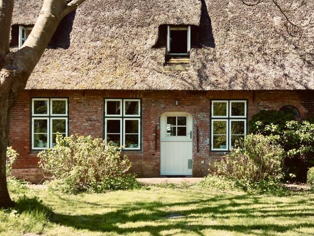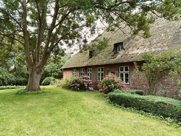 Versteckt zwischen alten Bäumen und duftenden Heckenrosen, eingebettet in die weite Stille Nordfrieslands, offenbart sich ein wahres Juwel: ein traumhaftes Reetdachhaus, das Ruhe und Rückzug verspric...