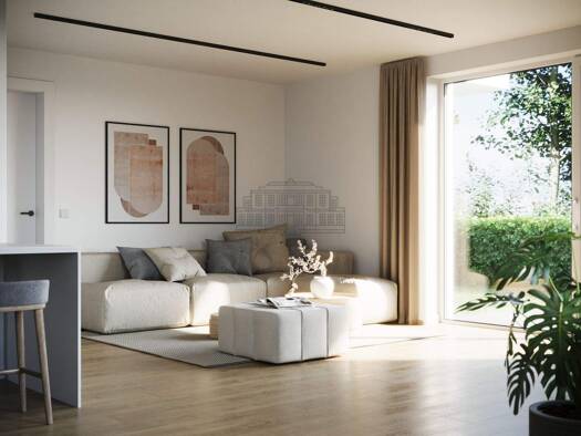Treten Sie ein in Ihre neue Wohlfühl-Oase: Im Wohnbereich verbreiten warmer Parkettboden und eine Fußbodenheizung der neuesten Generation Gemütlichkeit. Mit großformatigen Fliesen und exklusiven Desi...