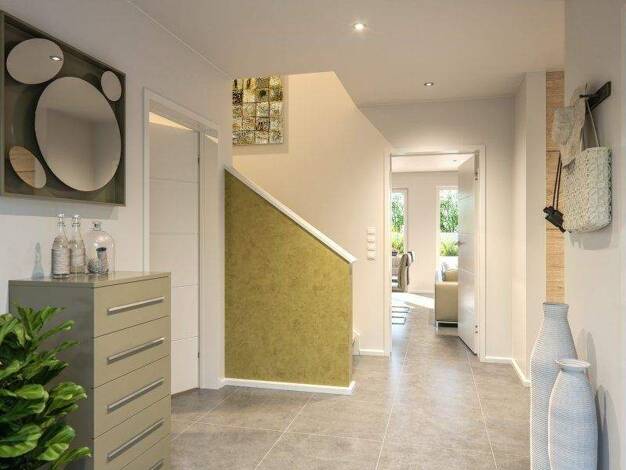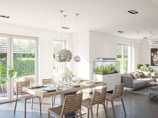 In diesem Einfamilienhaus (Clou 169) werden stilprägende Akzente durch die 46 m² große Kombination aus Kochen, Essen und Wohnen gesetzt. Außergewöhnlich ist die zentrale Lage der geradeläufigen Trepp...