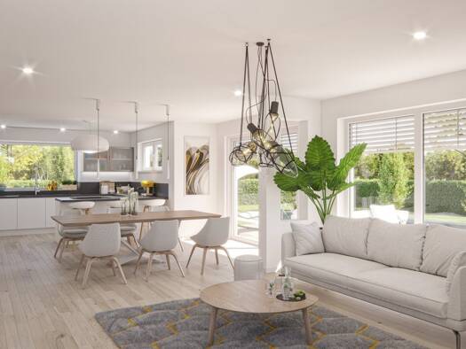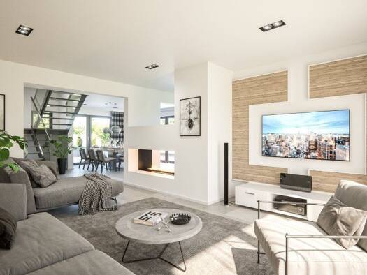 In diesem Einfamilienhaus (Clou 169) werden stilprägende Akzente durch die 46 m² große Kombination aus Kochen, Essen und Wohnen gesetzt. Außergewöhnlich ist die zentrale Lage der geradeläufigen Trepp...