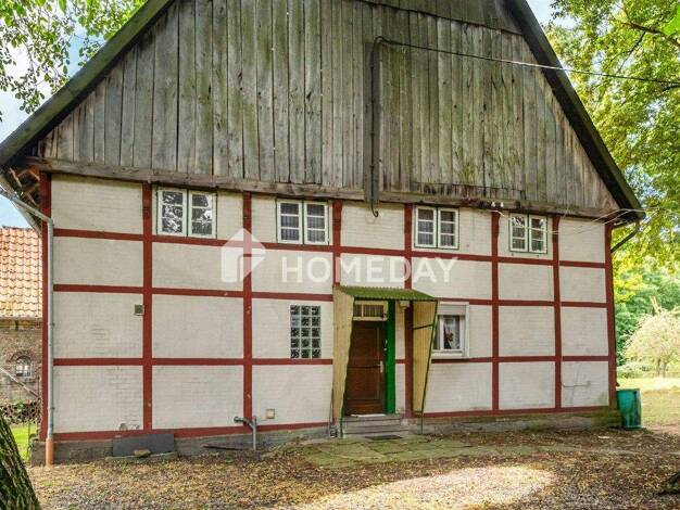 DER HOF | IN HERRLICHER ALLEINLAGE Umgeben von großgewachsenen Birken und einem alten Kastanienbaum befinden sich auf dem Hof ein Wohnhaus sowie zwei Stallgebäude, die früher als Hühner- und Schweine...