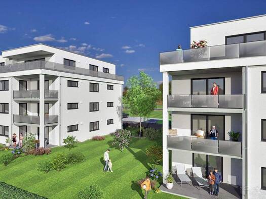 Wir bieten Ihnen diese schicke exclusive Wohnung für Kapitalanleger als auch Eigennutzer mit einem großen Balkon im 1. Obergeschoss mit Blick ins Grüne zu der ein Kellerraum und ein Stellplatz am Hau...