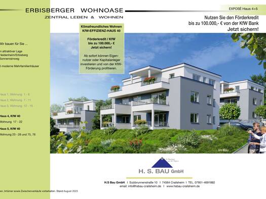 Haus 1 fertiggestellt und bereits bezogen. Haus 2 und Haus 3 in Fertigstellung, Bezug August 2024. Haus 4 und Haus 5 Innenarbeiten, Bezug September 2024.\n\nDie Firma HS. Bau GmbH mit Sitz in 74564 C...