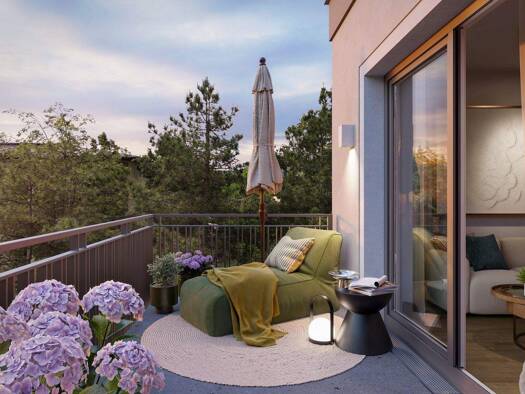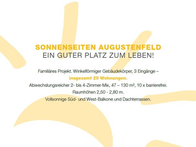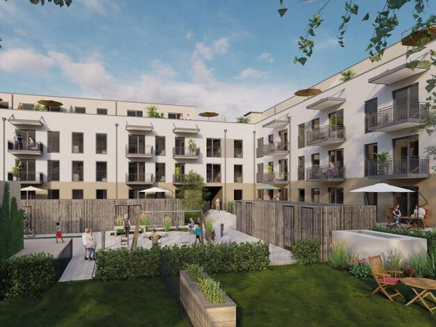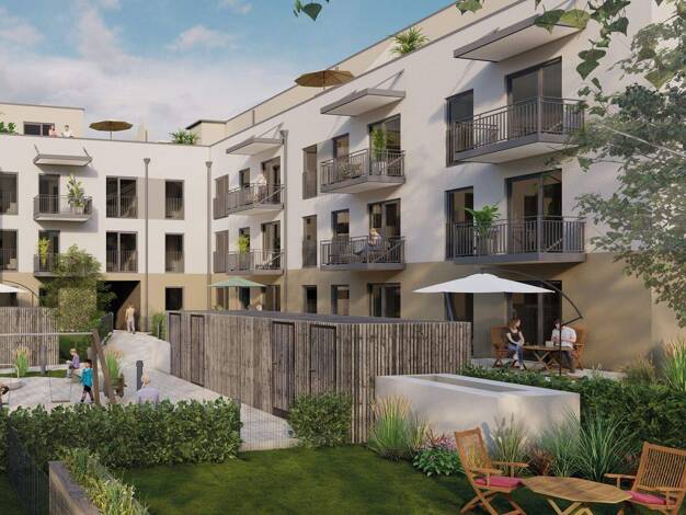 Klare Architektur in Massivbauweise prägt unseren winkelförmigen Baukörper. In seinem Schutz breitet sich ein ruiger Innenhof mit Gemeinschaftsflächen und Schrebergärten aus und auch die vollsonnigen...