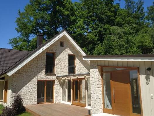 Die Doppelhaushälfte präsentiert sich im Mountain-House-Heritage-Stil. Die Gestaltung und Auswahl der Materialien zeugen von Designharmonie und einem wohnlichen Charme. Umgeben von Wald, liegt das Ha...