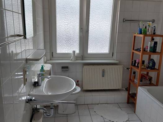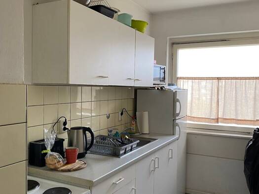 Das Zimmer befindet sich in einer Wohngemeinschaft (WG) mit gemeinsam genutztem Badezimmer sowie einer Gemeinschaftsküche, ausgestattet mit Spüle, Herd und Kühlschränken. Eine Waschmaschine steht all...