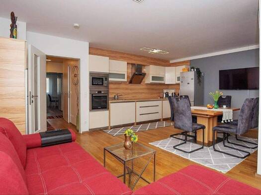 Diese wunderschön möblierte 3-Zimmer-Wohnung mit 70 m² Wohnfläche ist luxuriös ausgestattet und verfügt über ein geräumiges Wohn- und Esszimmer, zwei Schlafzimmer mit Doppelbetten, eine Küche mit Sit...