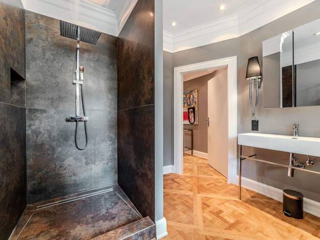 Objektbeschreibung Beim Betreten dieser prachtvollen Wohnung werden Sie sofort von der zeitlosen Eleganz und dem stilvollen Ambiente verzaubert. Die Deckenhöhe von 3,60m verleiht den Räumen eine beei...