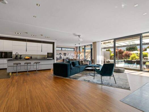 Dieser stilvolle Bungalow bietet Wohnen auf einer Ebene in einer besonders angenehmen und hochwertigen Atmosphäre. Große Fensterflächen, klare Linien und ein offener Wohn- und Essbereich mit Kamin pr...